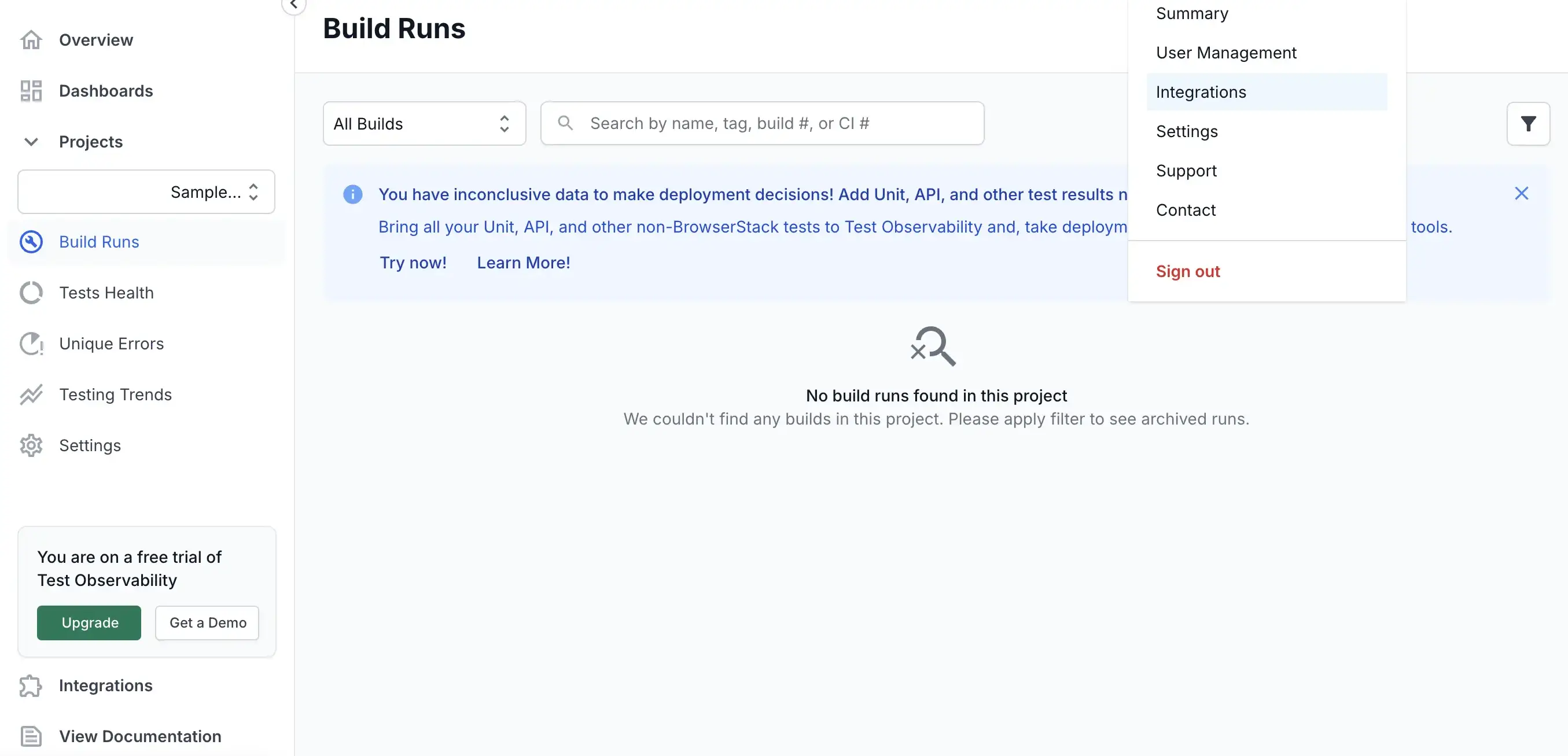 - Sign in to BrowserStack Test Reporting & Analytics.