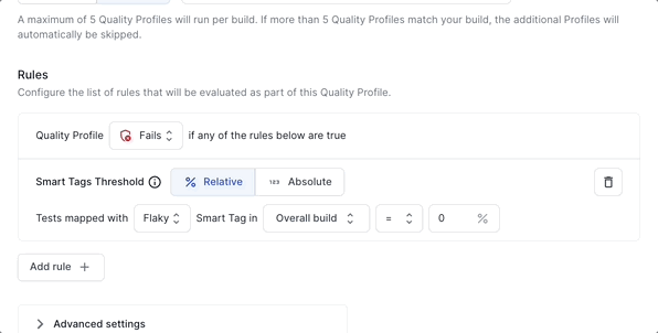 - Set absolute or relative thresholds on the various smart tags mapped to tests in your build.