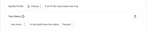 Passes Ifprofile requires all rules to betrueto pass. If any rule isfalse, the profile fails. (E.g. A profile contains 5 rules, 1 rule is evaluated to false, then the profile fails). This type of profile can be used to ensure that all rules meet the baseline thresholds or requirements for a build. - A