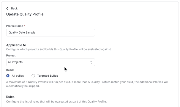 All buildswithin a project, or target specific builds either byBuild NameorBuild Tags. This will help you isolate your Quality Profiles to wherever they are relevant.