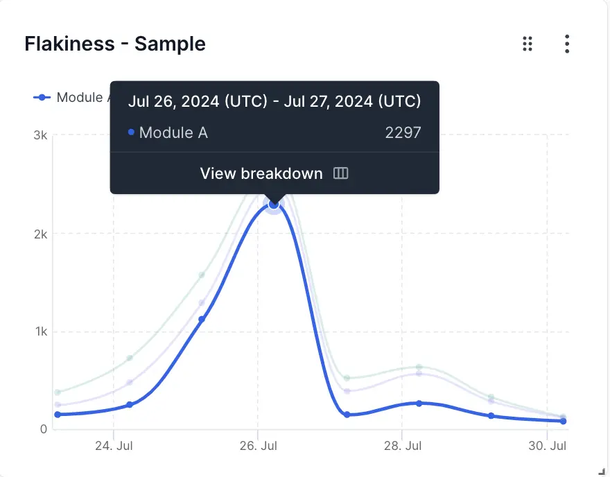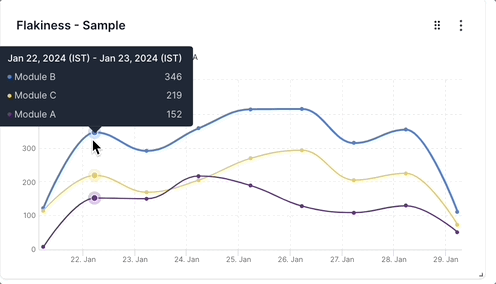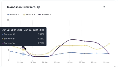 Here, the three line charts represent the flakiness in tests run on Browser A (purple line), Browser B (yellow line), and Browser C (blue line). This graph informs you that the flakiness of tests run on Browser A varies more than that of Browser B or C. Also, it tells that the tests run on Browser C display lesser flakiness than that of other browsers. You can analyze deeper using the drill-down feature. Using these insights you will be able to concentrate on reducing the flakiness in tests run on Browser A and B.
