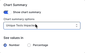 Chart Summary: A toggle to show or hide the chart summary, a concise banner that displays summarized information on your flakiness widget. In the flakiness widget, you can choose Unique Tests Impacted or Average Flakiness as the chart summary. By default, the flakiness widget displays Unique Tests Impacted as the chart summary. You can also choose to show or hide this chart summary. Chart summary is available only on widgets with a single segment.
