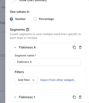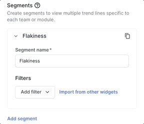 Segments: Add up to five segments in the Flakiness widget using the Add segment option. These segments appear as separate line charts in the widget. Segments should be used along with filters. You can use various filters in each segment to compare different projects, builds, users, etc.