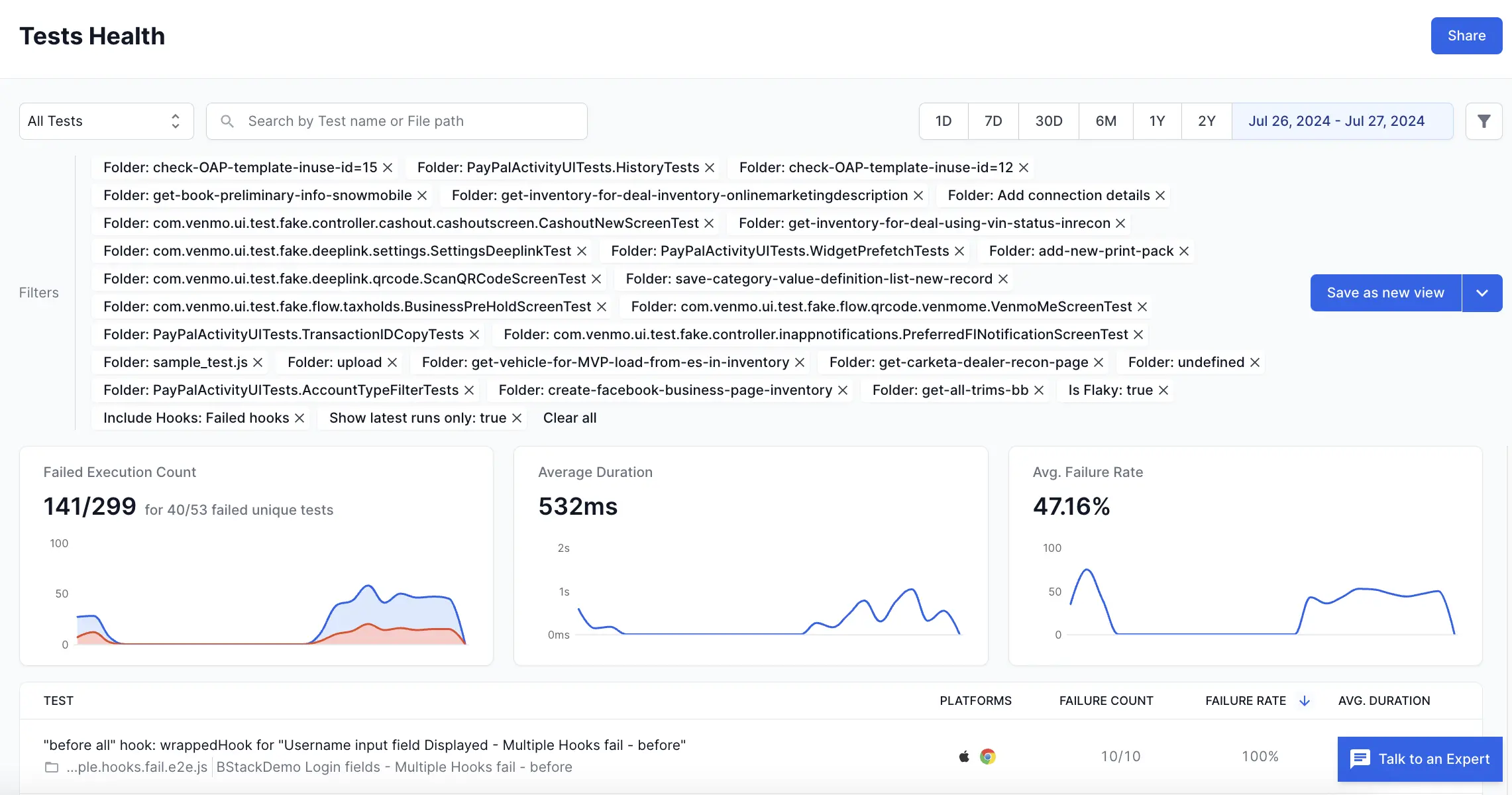 This opens Tests Health in a new tab with the applicable filters. On Tests Health, you can view the individual flaky tests so that you can further investigate what caused the flakiness.
