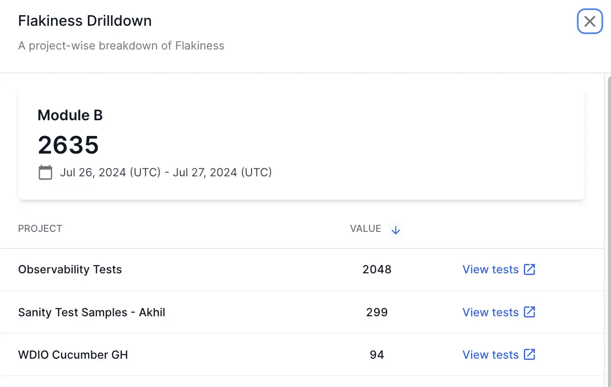- Hover on any point in the Flakiness widget and click View breakdown. A project-wise breakdown of the flakiness metrics for the selected date range opens up in a side pane.