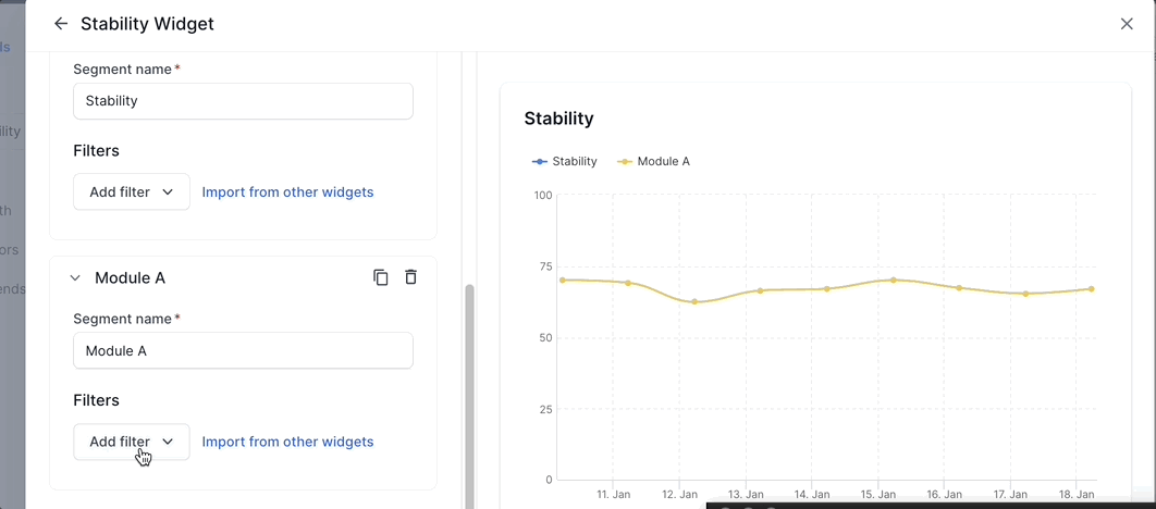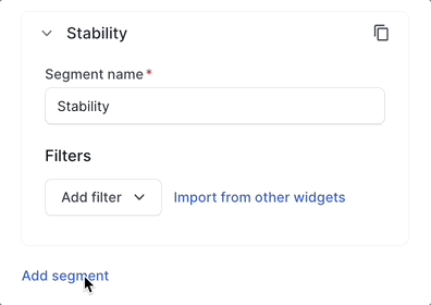 Segments: Add up to five segments in the Stability widget using the Add segment option. These segments appear as separate line charts in the widget. Segments should be used along with filters. You can use various filters in each segment to compare different projects, builds, users, etc.