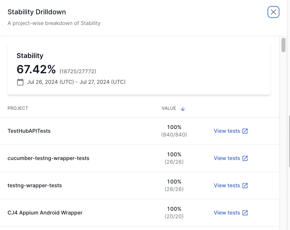 - Hover on any point in the Stability widget and click View breakdown. A project-wise breakdown of the stability metrics for the selected date range opens up in a side pane.