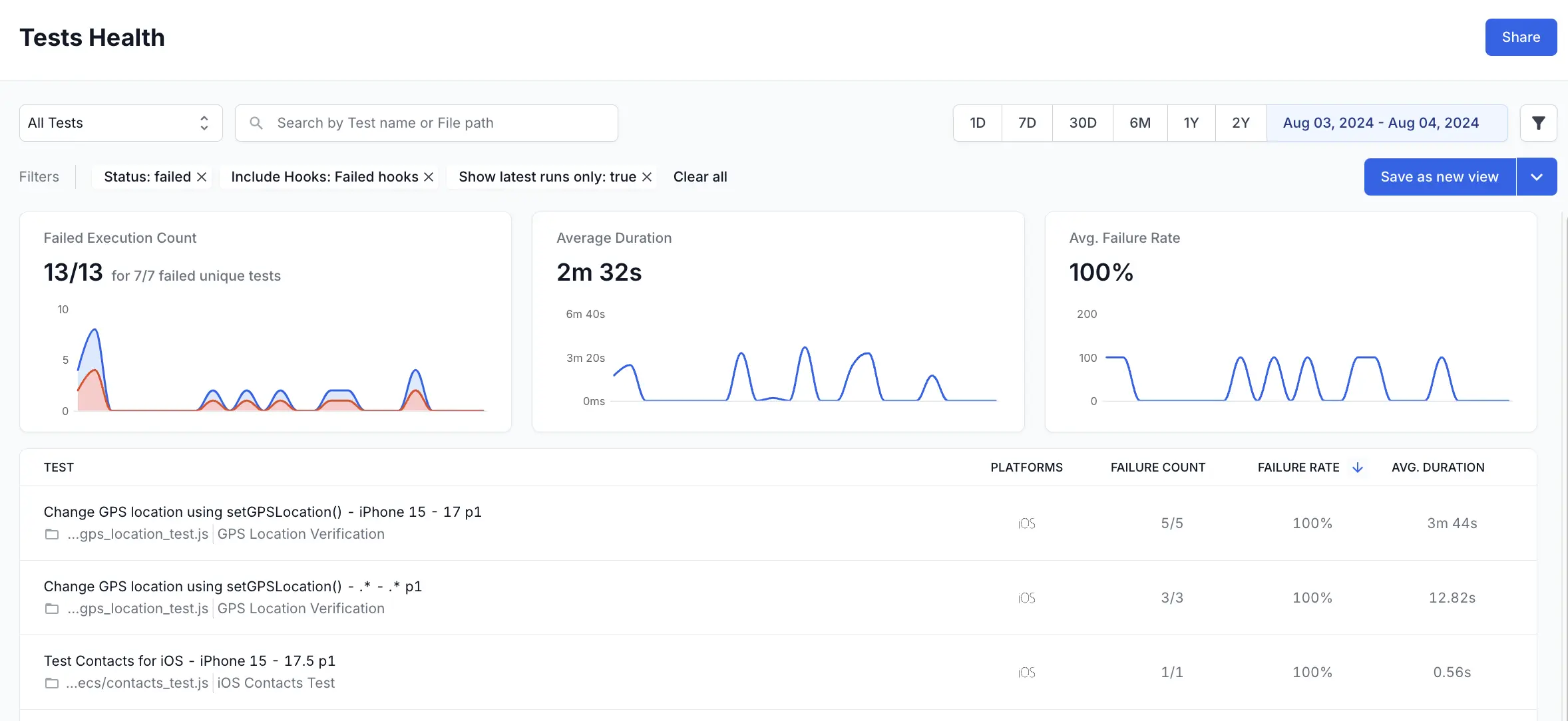 This opens Tests Health in a new tab with the applicable filters. On Tests Health, you can view the individual tests that always fail to investigate further.