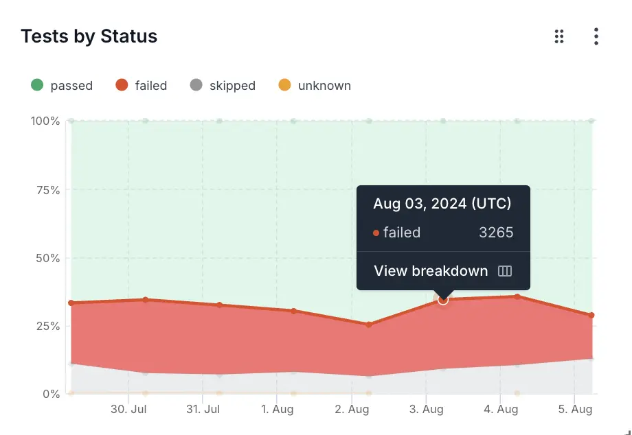 This chart helps you visualize the distribution of test statuses over time. You can choose to include or exclude Passed, Failed, Skipped, and Unknown tests in the visualization. An upward trend in the Passed tests and a downward trend in the Failed tests indicate an improvement in the testing activity over time.