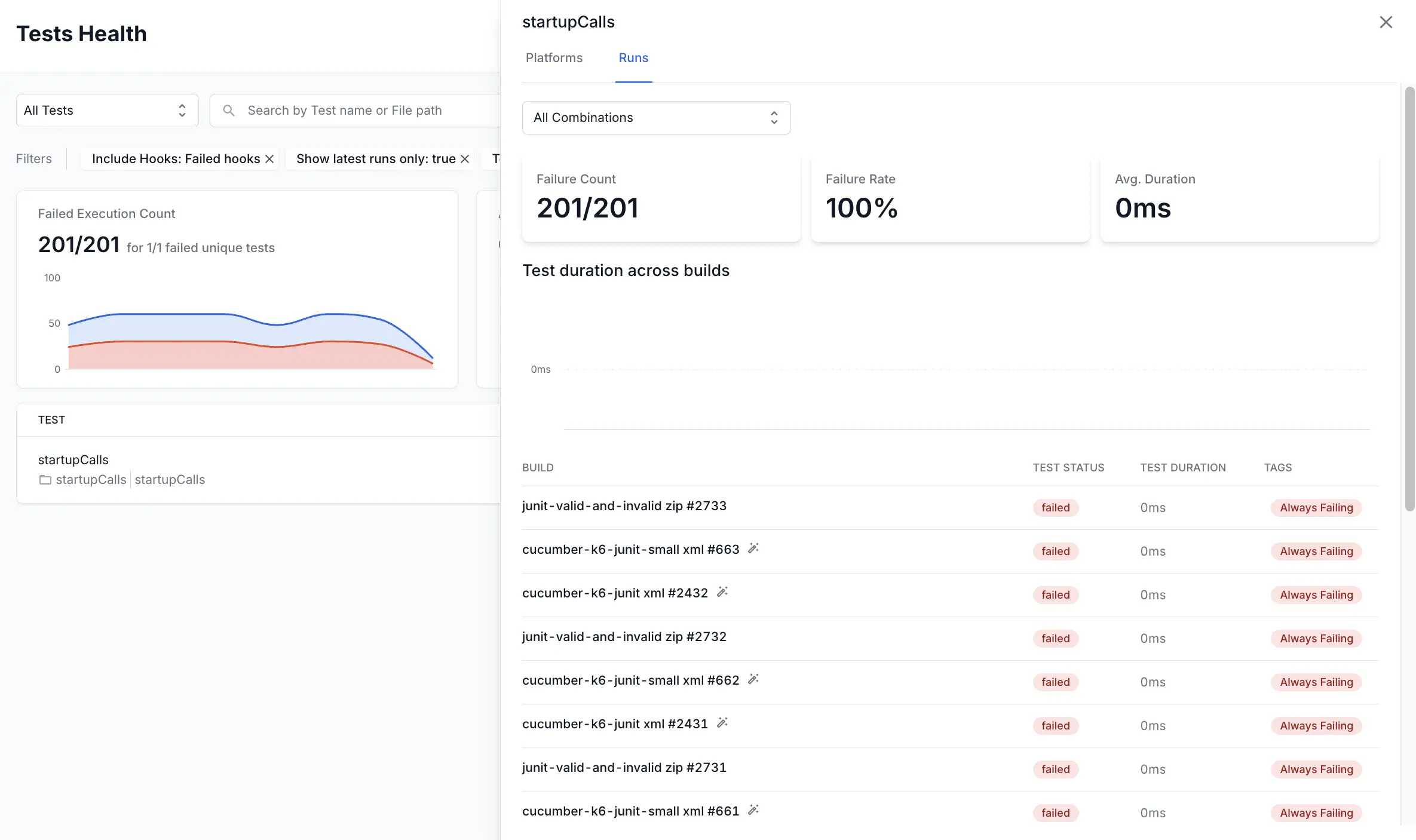 2. This opens Tests Health in a new tab with the applicable filters. On Tests Health, you can view the individual tests with the highest failure rate, for further investigation. Tests Health window from top unstable tests
