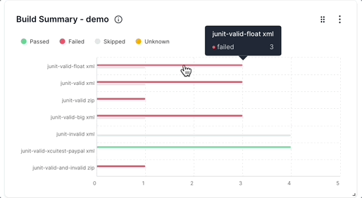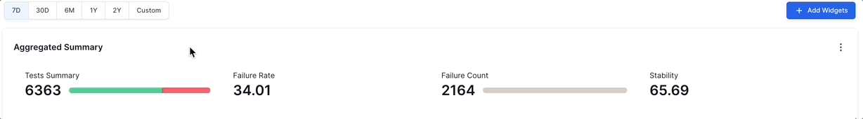 This widget is a concise summary banner in which you can include the most valuable insights about selected projects and builds. You can include information like Tests Summary, Failure Rate, Failure Count, Stability, Flakiness, Muted Tests, New Failures, Always Failing, Defect Summary, Platforms Covered, and Unit Test Cases.