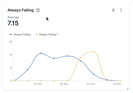 In the Always Failing widget, you can choose Unique Tests Impacted or Average as the chart summary. You can configure the widget to display or hide the chart summary. Using the See values in setting, you can also choose the values in the widget to appear as a number or as a percentage.