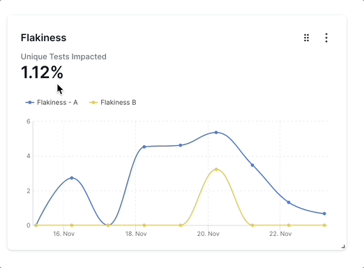 This widget illustrates the change in the percentage of flaky tests as per the conditions set in the Flaky Smart Tag. A higher percentage of flaky tests or an upward trend indicates quality issues in your automation tests.