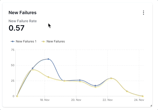 In the New Failures widget, you can choose Unique Tests Impacted or New Failure Rate as the chart summary. You can configure the widget to display or hide the chart summary. Using the See values in setting, you can also choose the values in the widget to appear as a number or as a percentage.
