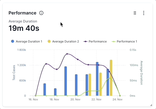 This widget helps you understand if the performance of your test setup is improving or worsening over time, enabling you to uncover bottlenecks in your testing. It illustrates the number of test cases and the average duration of projects, builds, etc over time on a line chart. If the average duration trends downwards, it indicates that the performance is improving.