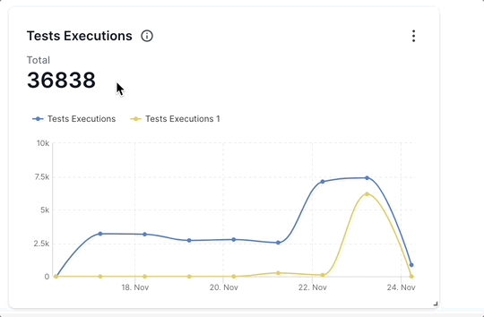 You can add up to five segments in the Tests Executions widget using the Add segment option while creating the widget. These segments appear as separate line charts in the widget. Such segments can be used to compare different projects, builds, users, etc.