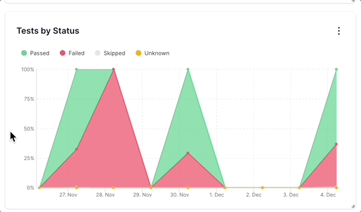 This chart helps you visualize the distribution of test statuses over time. You can choose to include or exclude Passed, Failed, Skipped, and Unknown tests in the visualization. An upward trend in the Passed tests and a downward trend in the Failed tests indicate an improvement in the testing activity over time.