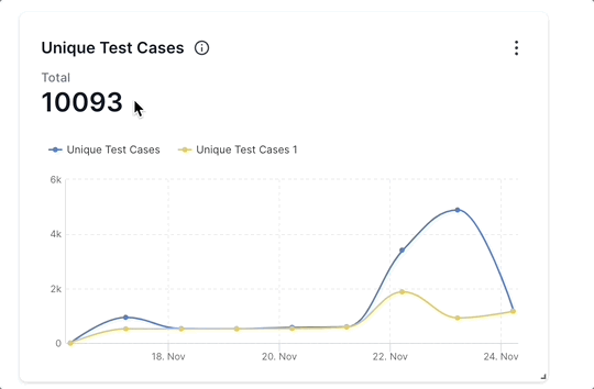 You can add up to five segments in the Unique Test Cases widget using the Add segment option while creating the widget. These segments appear as separate line charts in the widget. Such segments can be used to compare different projects, builds, users, etc.