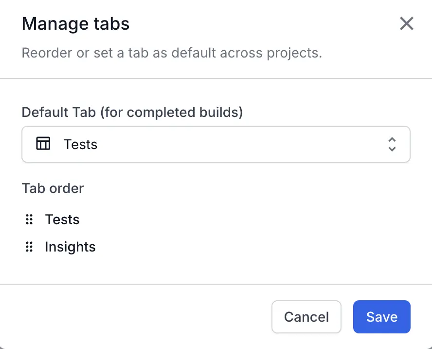 You can choose whether Insights or Tests tab opens by default when you click a build from Build Runs. You can also select the order of these tabs.