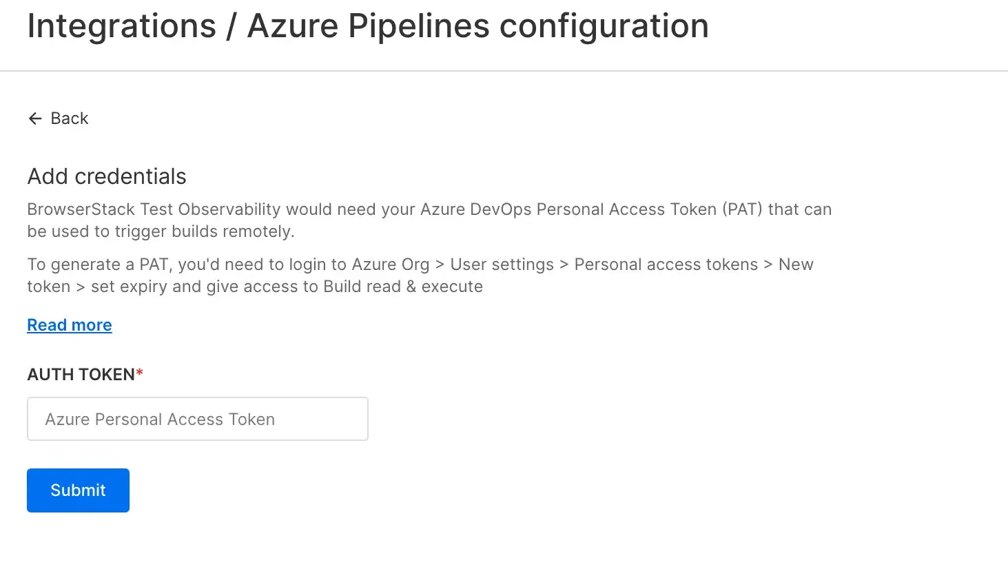 - BrowserStack Test Reporting & Analytics would need your Azure DevOps Personal Access Token (PAT) that can be used to trigger builds remotely.