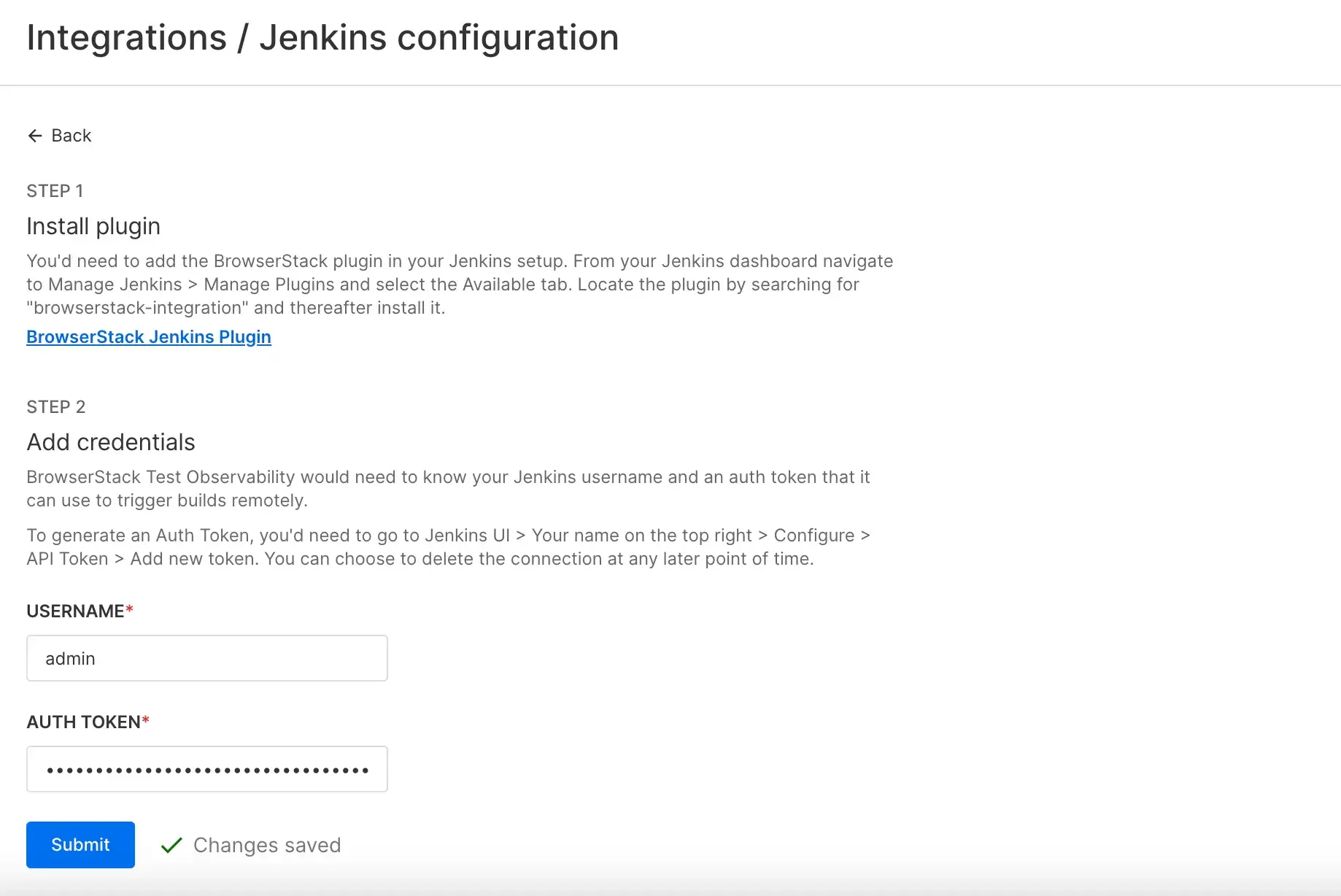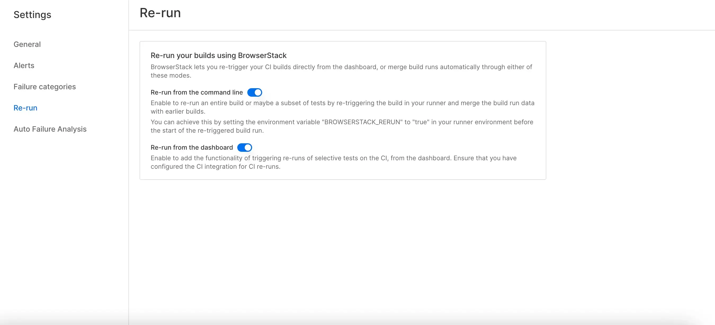 After enabling re-run from the dashboard setting, the next step is to configure a CI integration such that BrowserStack can trigger CI jobs on your behalf when you choose to re-run specific tests.