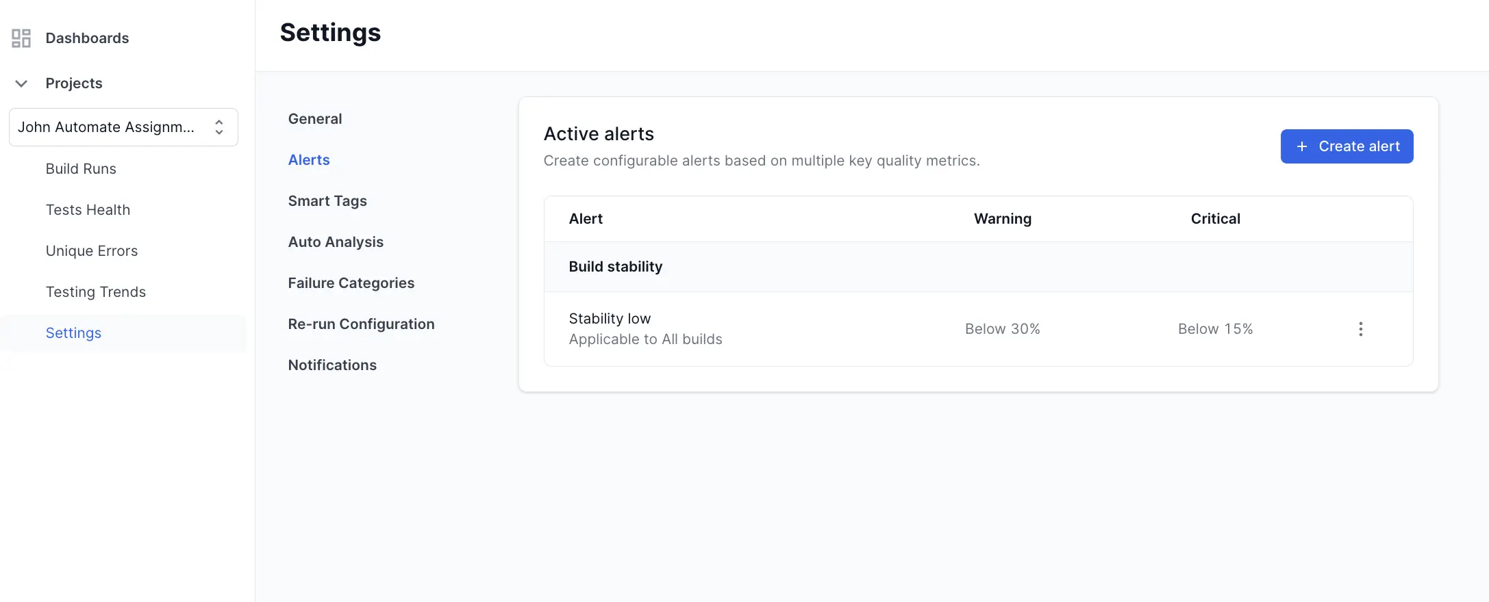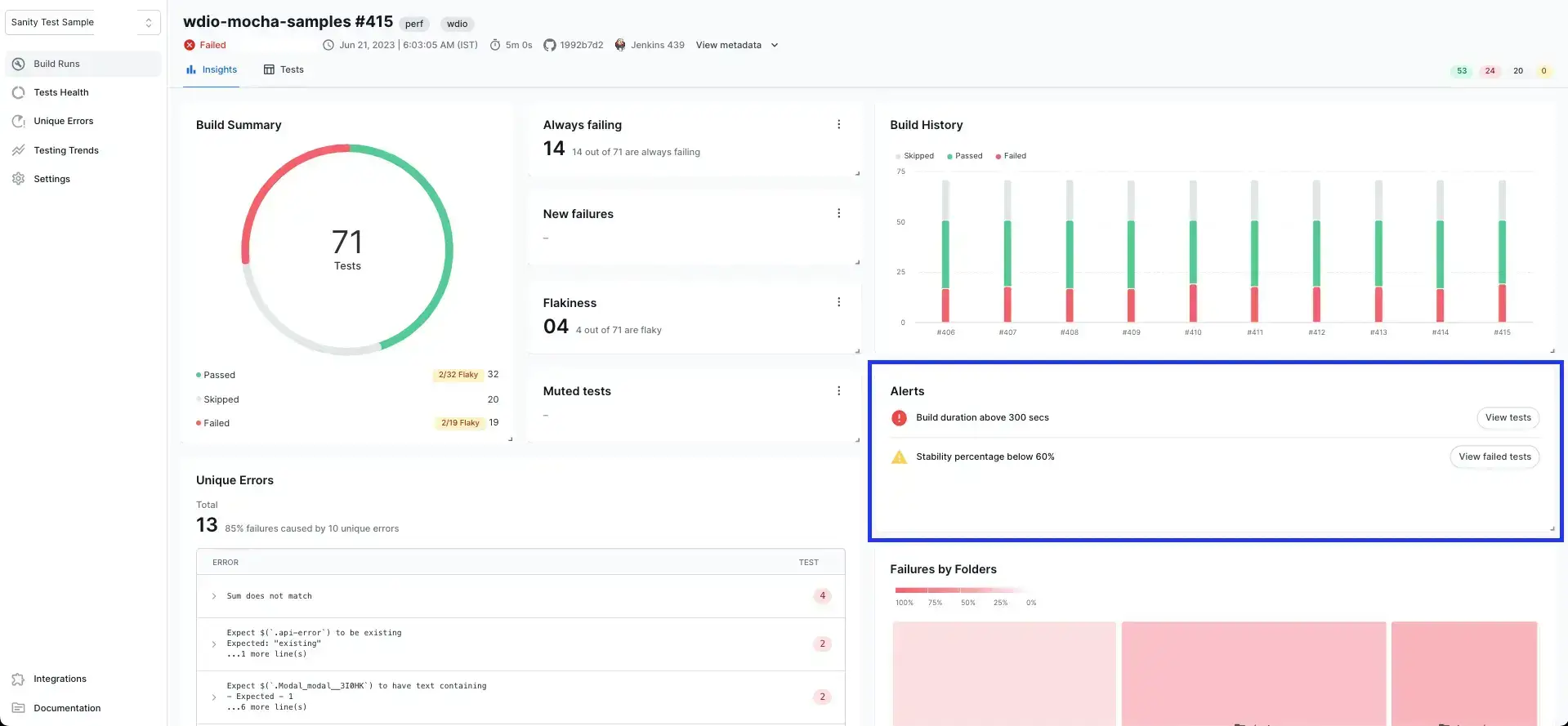 BrowserStack Test Reporting & Analytics allows users to set up custom rules for every build. If these rules are breached, you will see an alert on the Build Insights view, helping you quickly understand if the build crossed any quality standards you might have set.