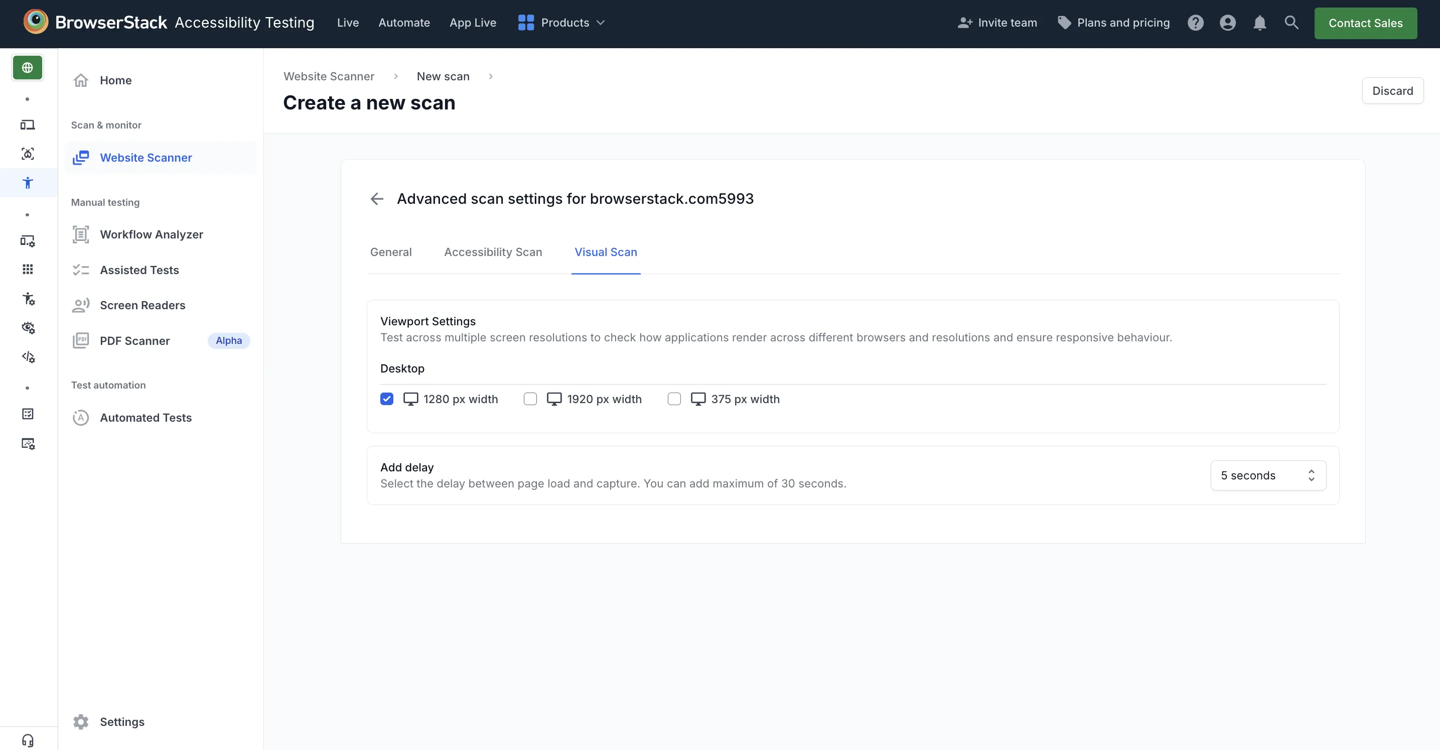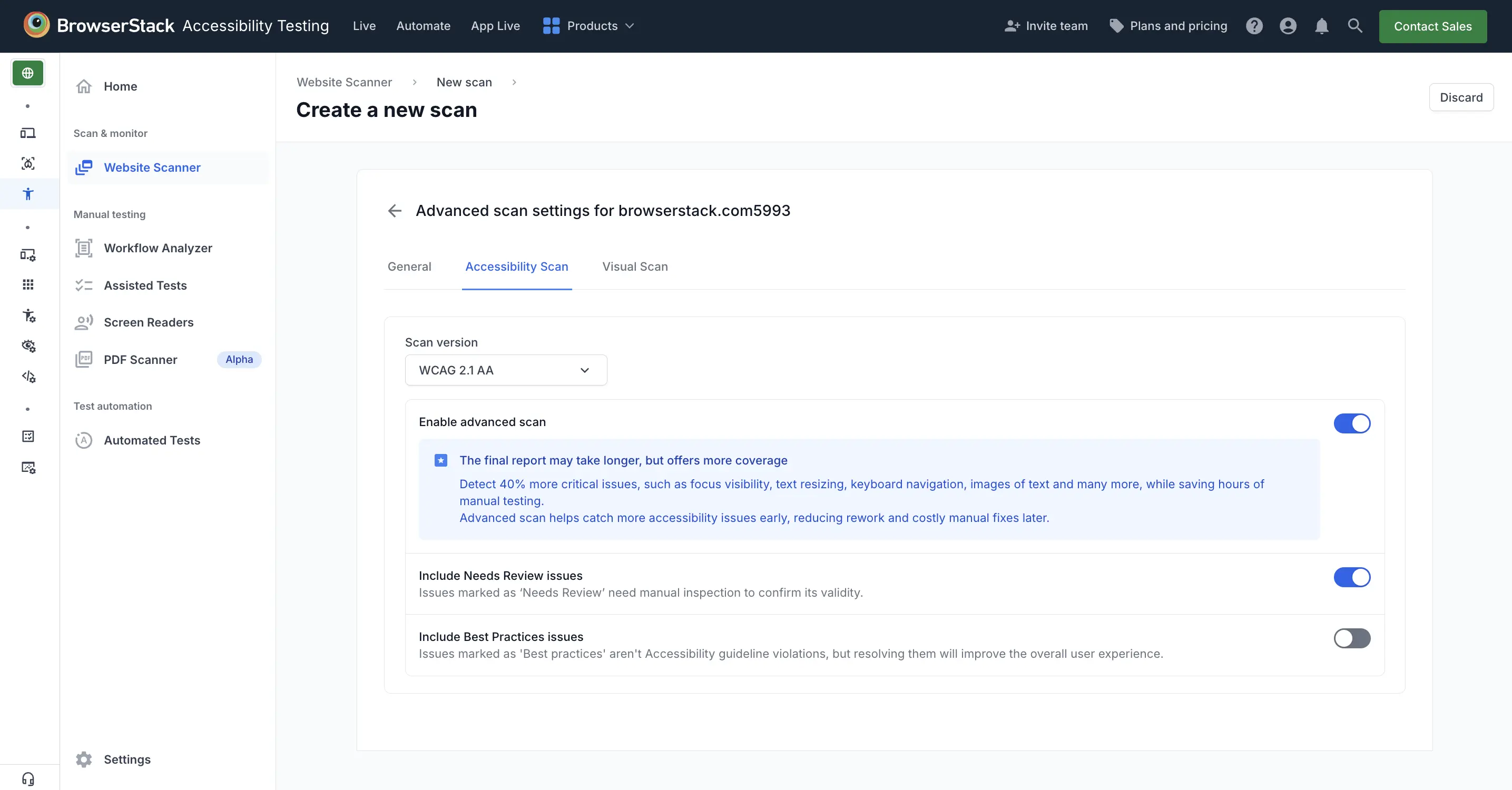 - From Accessibility Testing homepage, click Website Scanner > New scan. You are redirected to Website Scanner.