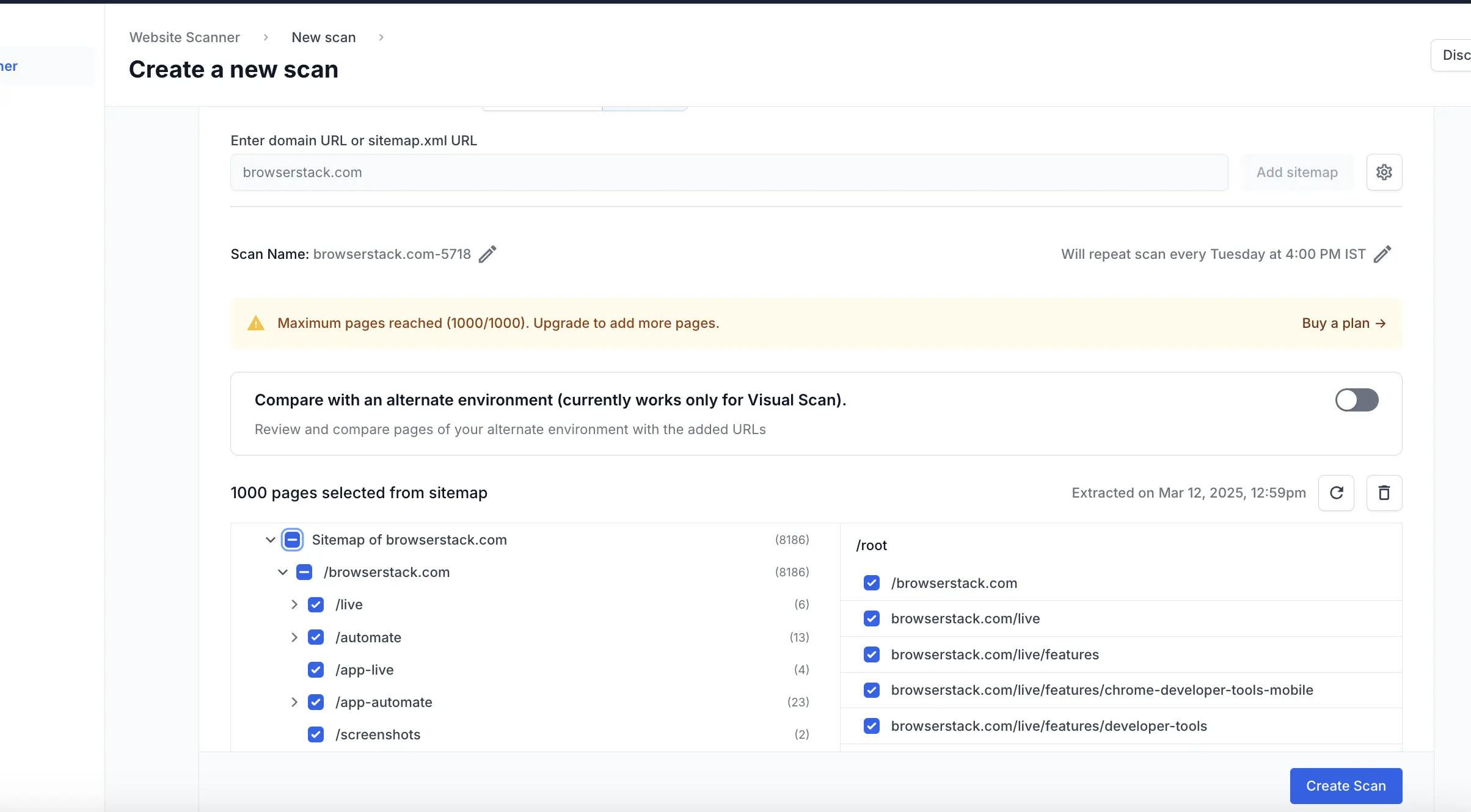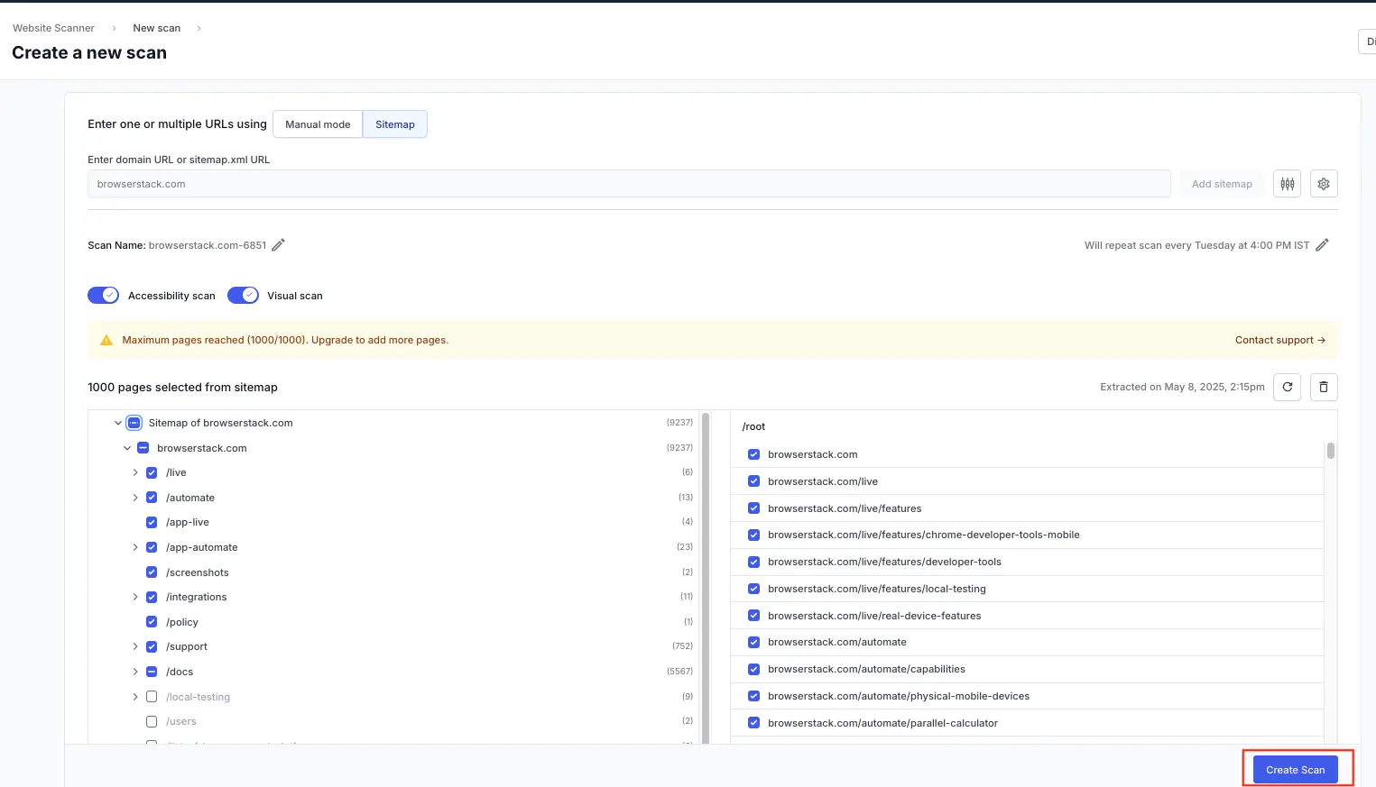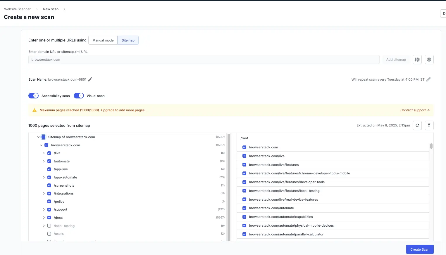 For visual testing, all URLs in the sitemap can be loaded, but a maximum of 1000 can be added to a particular scan by selecting or de-selecting URLs. By default, the first 1000 URLs are selected.