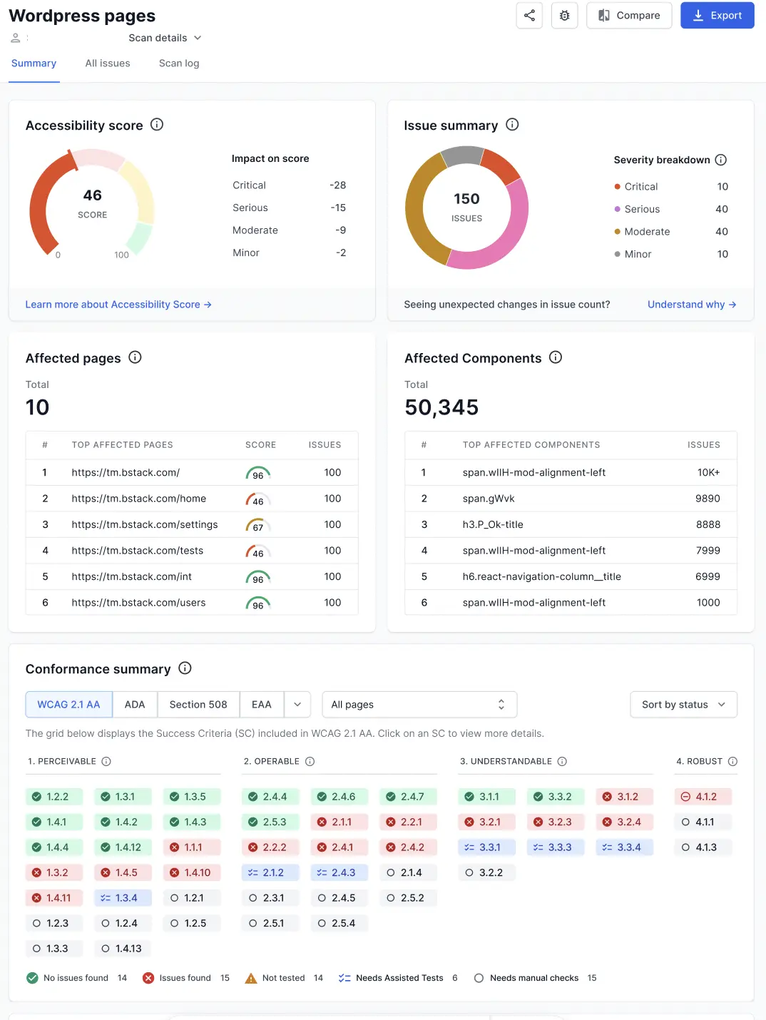 - In Accessibility scans, you can see three tabs: Summary, All issues, and Scan logs. The Summary tab shows a visual summary of the accessibility test. You can view the issues identified broken down based on their severity, the affected components and pages, issue category, conformance summary, issues that need review, and issues that are hidden.