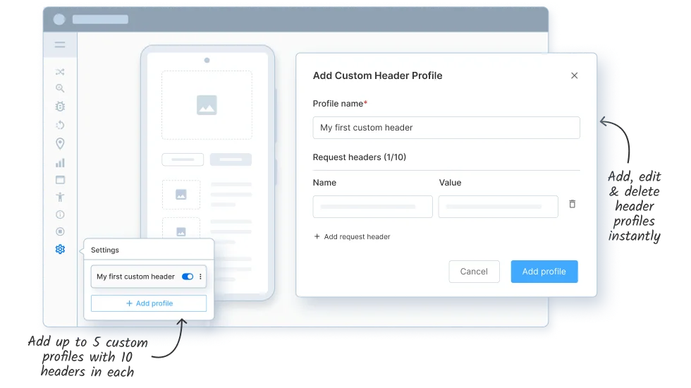 Test custom HTTP headers to simulate user scenarios, validate content personalization, and troubleshoot header-dependent web app behaviors within your BrowserStack Live session.