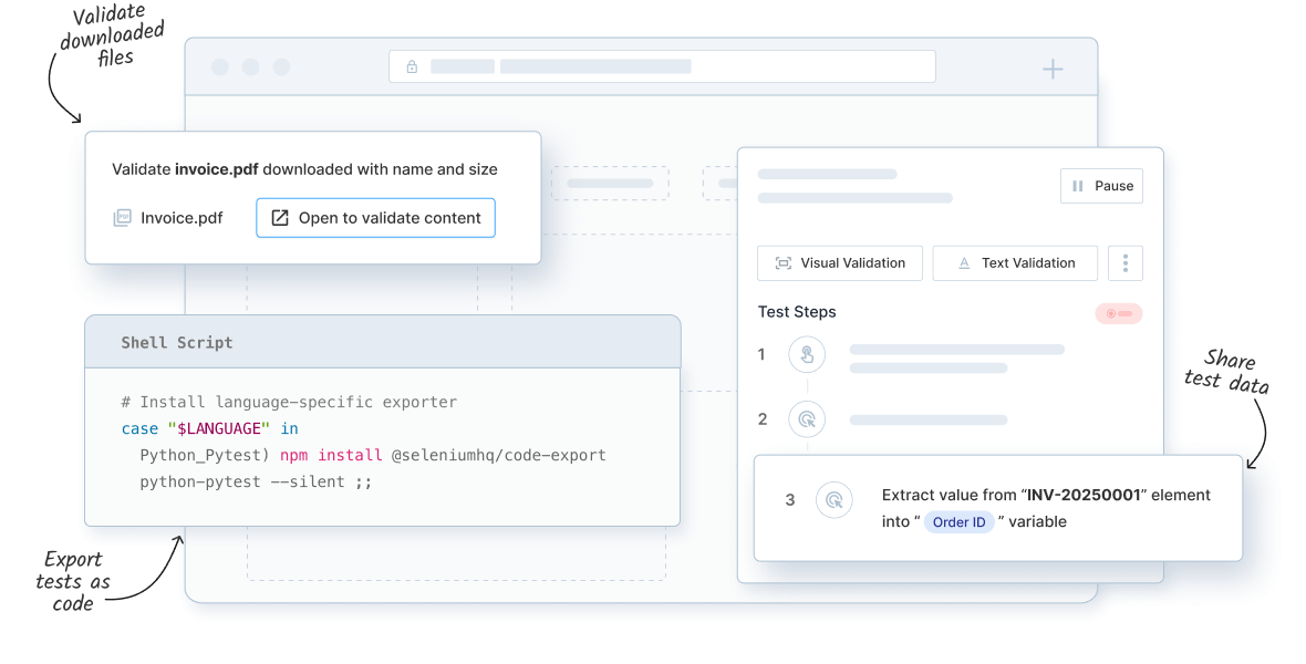 Leverage powerful features like validating downloaded files and content, sharing test data across tests and exporting tests as code to seamlessly handle complex test scenarios.