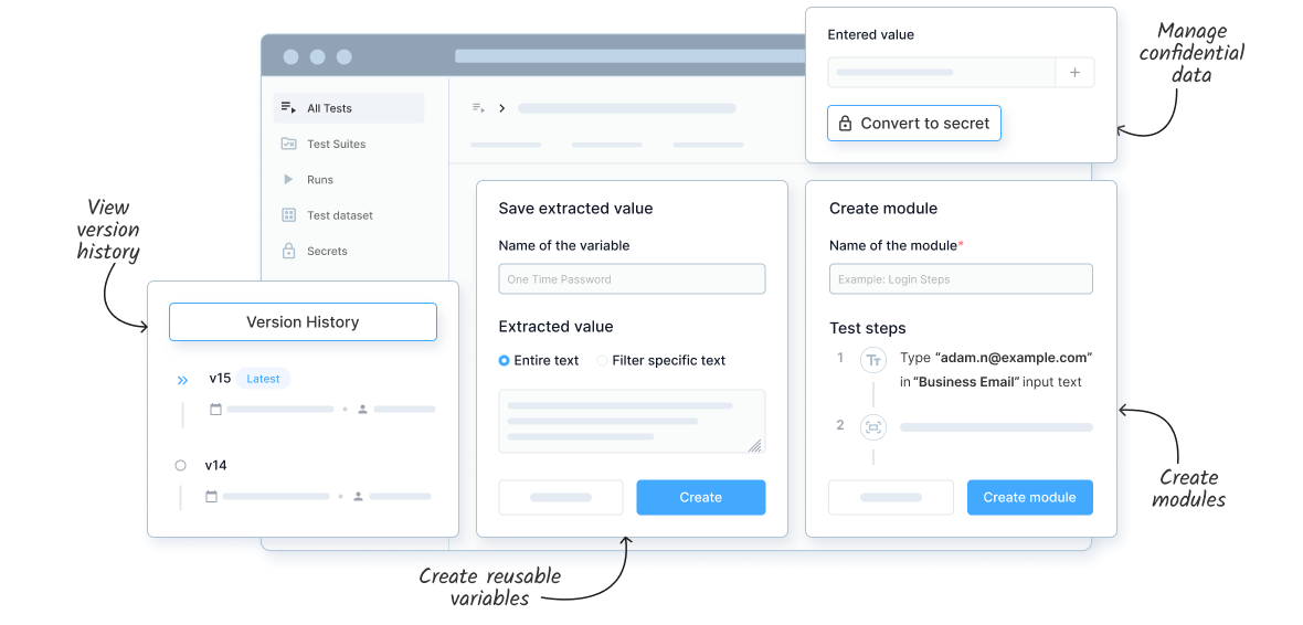 Securely store and use confidential information like login credentials and API keys within your tests, ensuring sensitive data is never exposed.