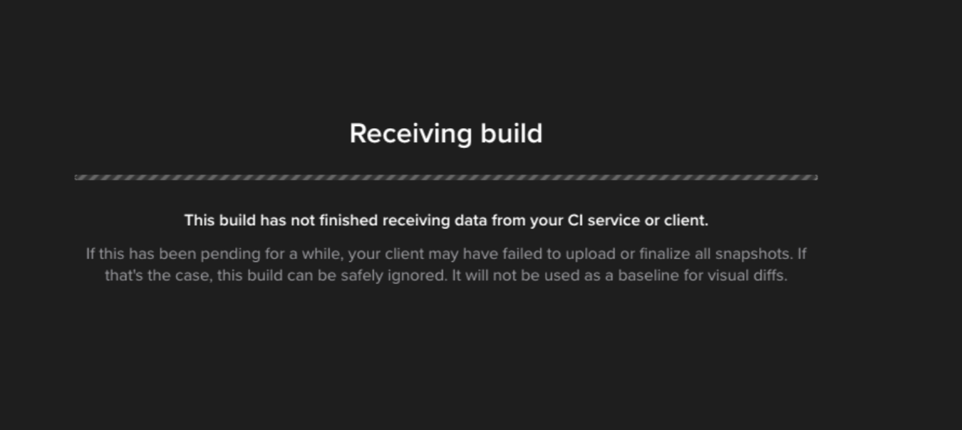 When the Percy build is stuck on the “Receiving build” screen it indicates that your Percy client/SDK or CI/CD may have failed to upload or finalize all the snapshots in the build. This could be due to an error during the Percy build process.