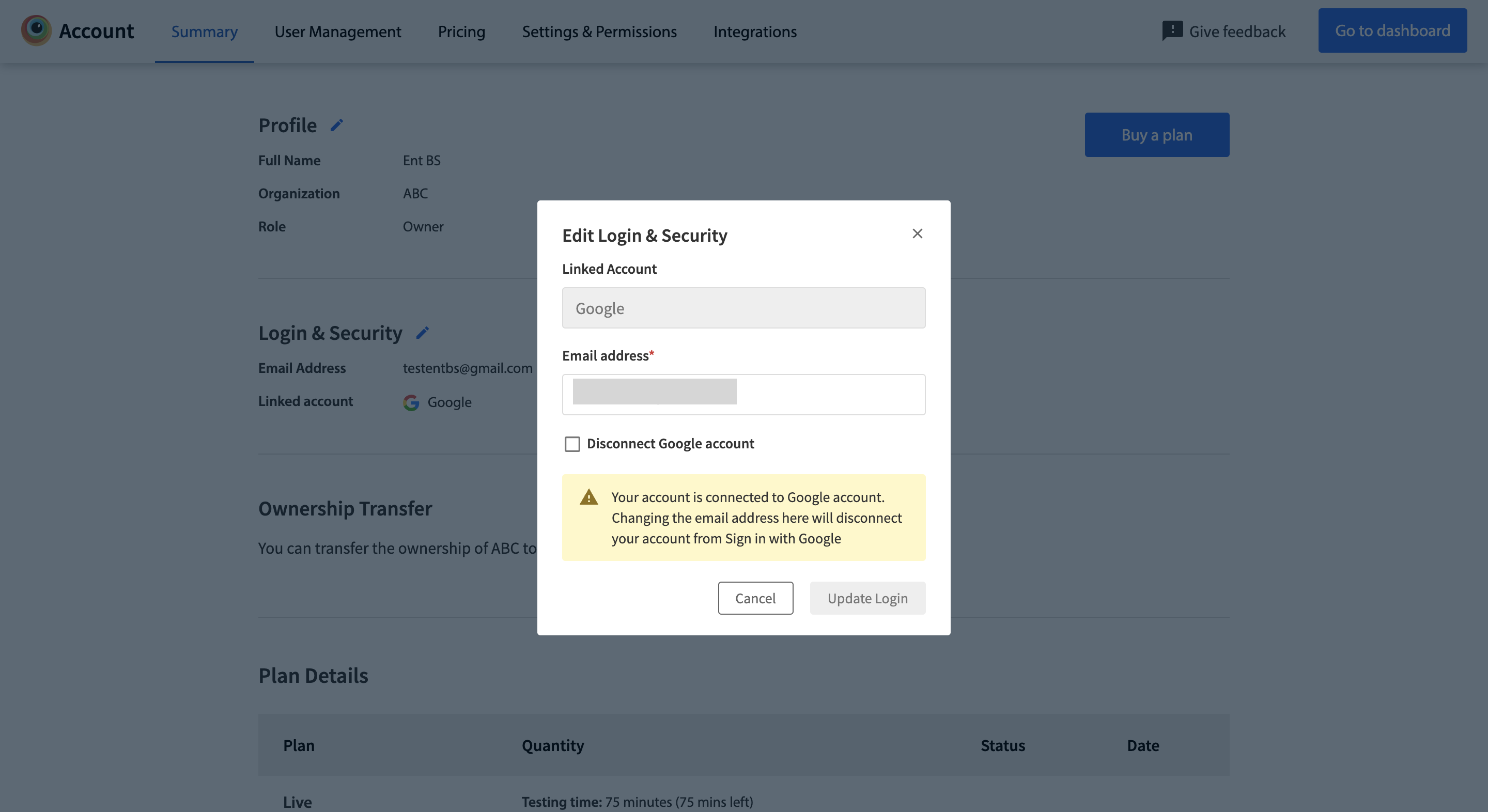 4. Select the Disconnect Google account checkbox to disconnect Google on the form and click Update Login.