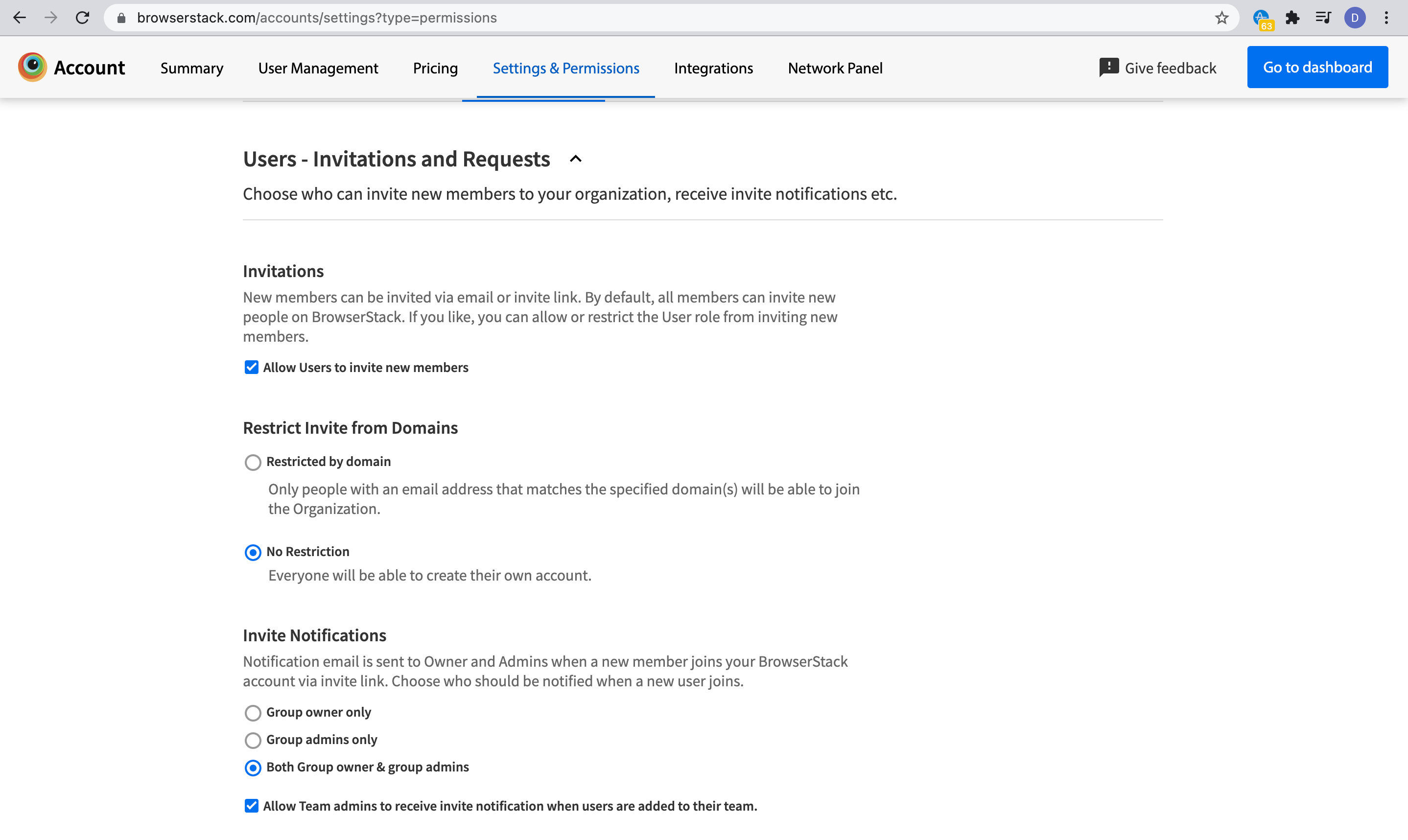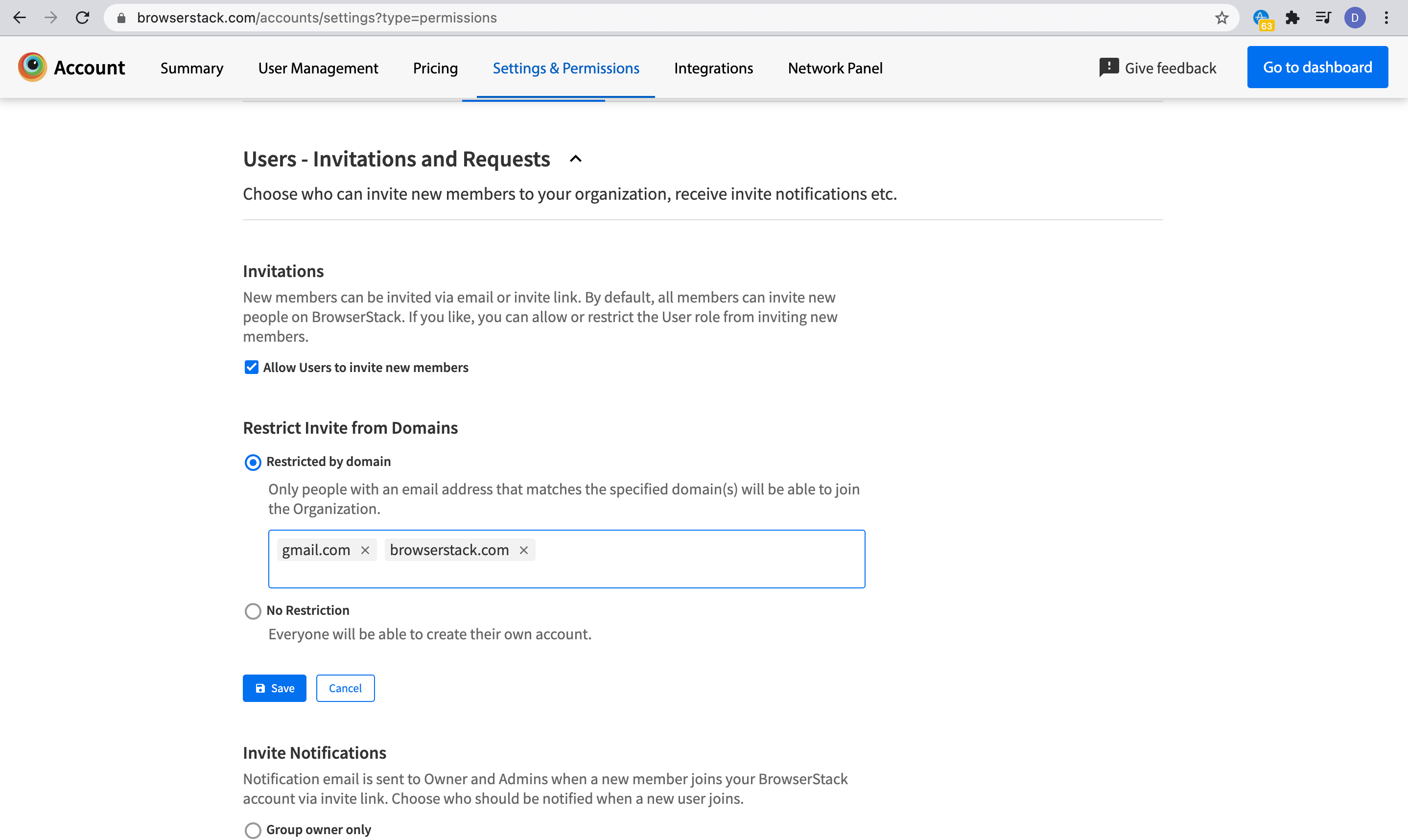 The owner can now restrict domains from which users can join their organization on BrowserStack. Setting this up will restrict invitations to only be sent to the domains restricted by the owner of the group.