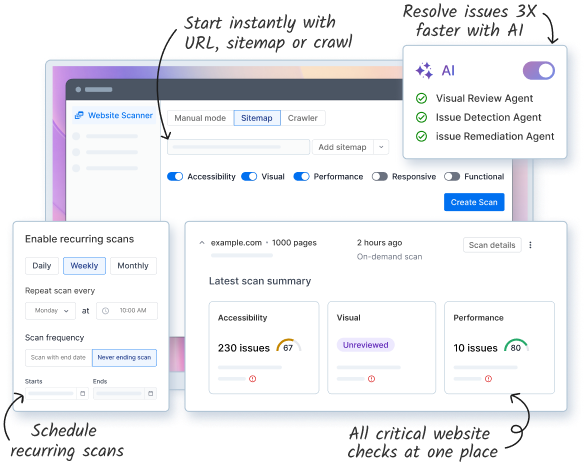 All-in-one tool to scan, detect & fix website performance, broken links, accessibility, responsiveness, visual & other issues.